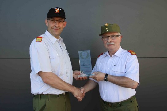 Unlängst beim Abschluss des Atemschutzlehrganges waren nicht nur die Teilnehmer im Innenhof der Landes-Feuerwehrschule angetreten sondern auch die Ausbilder und Mitarbeiter der Feuerwehrschule um ihrem Chef zu gratulieren und ihm für seine 25-jährige erfolgreiche Tätigkeit an der Spitze der Oö. Landes-Feuerwehrschule zu danken. Dabei waren mit Ehren-Oberbrandrat Karl Mitterlehner und Ehren-Brandrat Hans Gilbert Müller sozusagen auch zwei „Feuerwehrurgesteine“, die quasi schon zum Inventar der Landes-Feuerwehrschule zählen. Landesbranddirektor-Stellvertreter Robert Mayer überreichte Oberbrandrat Hubert Schaumberger ein Erinnerungsgeschenk und ein Buch über die Geschichte des Feuerwehrwesens im Bezirk Vöcklabruck. Von Abschnittsbrandinspektor Erwin Chalupar bekam der Hubert einen „Feuerwehrhut“ aus Leder. Und wenn er auf diesem einen Gamsbart anbringt, kann ihn der passionierte Jäger auch in seinem Revier in St. Leonhard tragen.