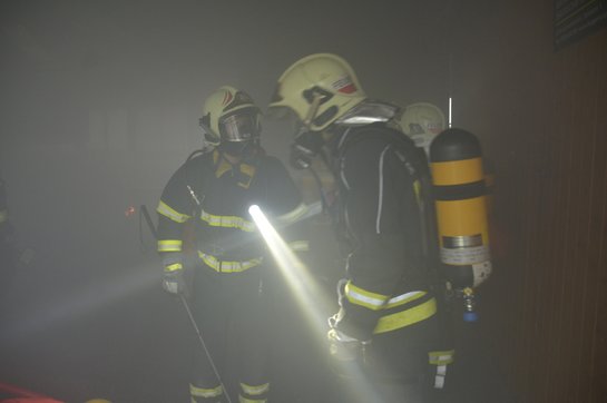 Für die Aufgabenstellung "Suchen & Retten" wurde die Stockschützenhalle zum Tunnel umfunktioniert. Mehrere Autos wurden positioniert und mit Statisten und Puppen besetzt, die es zu retten galt. Die Arbeit der Einsatzkräfte wurde durch eine realistische Verrauchung und laute Beschallung erschwert.