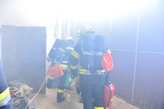 Eine vermisste Person im Brandobjekt hieß es bei der Alarmierung der Feuerwehr. Ein Atemschutztrupp machte sich voll ausgerüstet mit schwerem Atemschutz auf dem Weg durch den total verrauchten Räumlichkeiten in der Maschinenhalle um die vermisste Person aufzufinden und zu retten. Der Rauch verschlechterte die Sicht so stark, dass nicht einmal einen Meter weit gesehen werden konnte, um sehr realitätsnah zu üben.