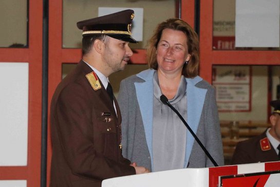 Von Pfarrassistentin Irmgard Sternbauer gesegnet wurden das neue Kleinlöschfahrzeug Logistik, ein Kommandofahrzeug und ein gasbetriebener Stapler.