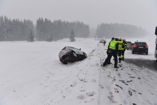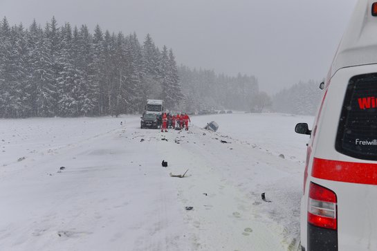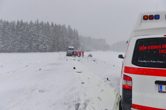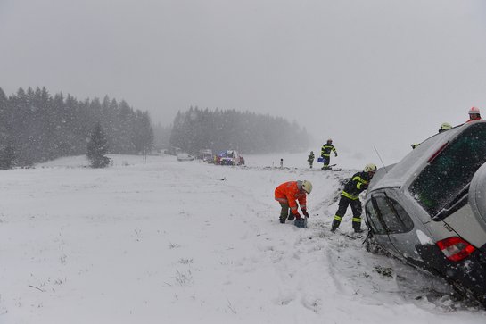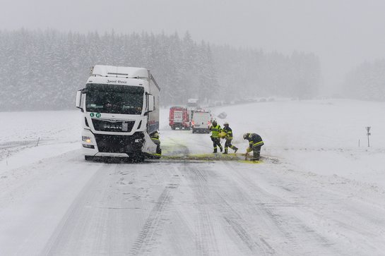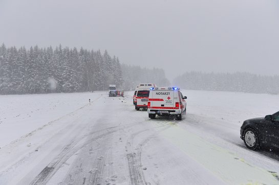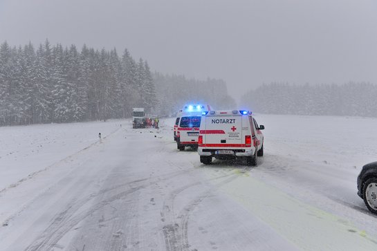 Aufgrund der Schneeglatten Fahrbahn kam es zu einem Frontalzusammenstoß eines Pkws mit einem Lkw. Durch die Wucht des Aufpralls wurde beim Lkw der Dieseltank aufgerissen wobei mehrere hundert Liter Diesel auf die Fahrbahn floss. Der Pkw wurde in den Straßengraben geschleudert wobei der Lenker unbestimmten Grades verletzt worden ist, und mit dem Roten Kreuz nach der Erstversorgung durch den Notarzt in das Landeskrankenhaus Freistadt gebracht wurde. Die Feuerwehren Rauchenödt und Sandl führten die Berge- & Reinigungsarbeiten durch sowie die Ölbindearbeiten durch.