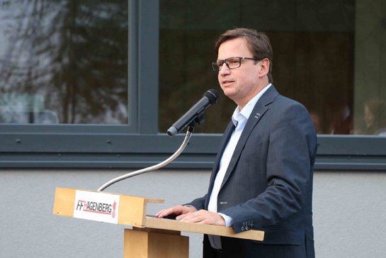 Kommandant Konrad Remplbauer konnte zum Festakt Abordnungen vieler Feuerwehren aus dem Abschnitt Pregarten sowie von der Partnerfeuerwehr Putzbrunn (Bayern), Vertreter mehrerer örtlicher Vereine, die zahlreich gekommene Bevölkerung von Hagenberg und eine große Anzahl an Ehrengästen, darunter Bürgermeisterin Kathrin Kühtreiber-Leitner, Nationalratsabgeordneter Nikolaus Prinz, Landtagsabgeordneter Peter Handlos, Bundesrat Michael Lindner, Landesbranddirektor-Stellvertreter Robert Mayer, Bezirks-Feuerwehrkommandant Franz Seitz, Brandrat Harald Dobusch und Bürgermeister Edwin Klostermeier aus Putzbrunn, willkommen heißen.