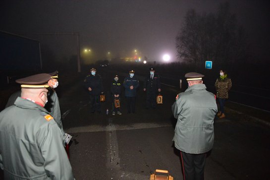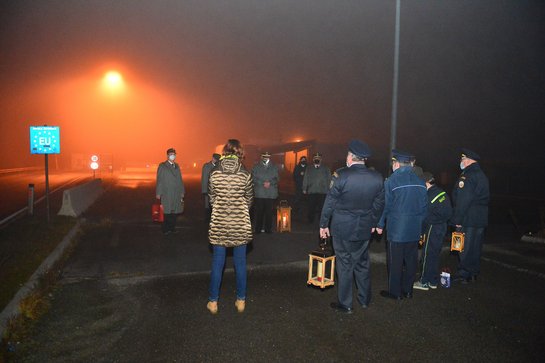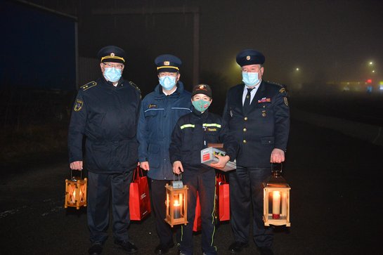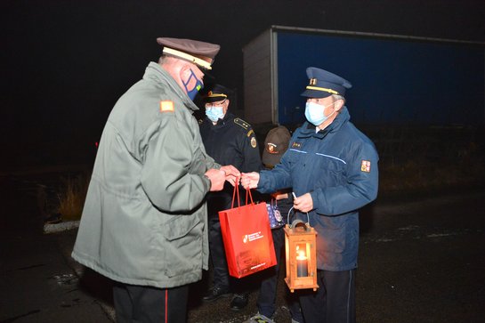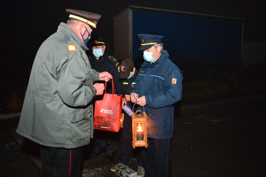 Dieses Jahr erstmalig konnte aufgrund der aktuellen Situation nicht die traditionelle Übergabe in der Kirche mit Publikum gemacht werden, deswegen entschloss man sich trotzdem die Tradition der Friedenslichtübergabe an die tschechischen Kameraden durchzuführen. Bezirksfeuerwehrkommandant Oberbrandrat Thomas Wurmtödter lud seine vier Abschnittskommandanten sowie den Ehren-Oberbrandrat Franz Seitz dazu ein, am Grenzübergang Wullowitz die Kameraden in Empfang zu nehmen, um ihnen das Friedenslicht zu übergeben. Dabei wurden auch die tschechischen Kameraden beschenkt, die uns auch freundlich und dankend bescherten.