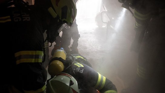 Die Station der FF St. Peter stellte sich einem anspruchsvollen Szenario: einem medizinischen Notfall eines Atemschutzträgers im Einsatz. Um die Situation möglichst realitätsnah darzustellen, entwickelte die FF St. Peter eine kleine Atemschutzübung. Der Rettungstrupp der Feuerwehr musste in ein verrauchtes Gebäude eindringen, um den in Not geratenen Kameraden zu retten und ihn anschließend der Mannschaft des Roten Kreuzes zur Versorgung zu übergeben. Die Übung diente unter anderem dazu, die Handhabung mit Atemschutzgeräten zu trainieren und den Fokus auf die schonendste Rettungsmethode eines verunfallten Atemschutzträgers zu legen.