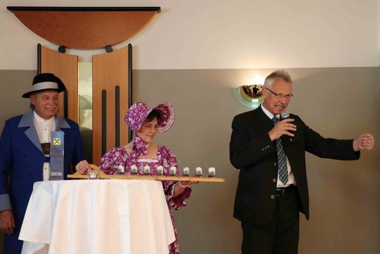 Bürgermeister Stockinger stellte die Gemeinde vor, die geladenen Gäste stärkten sich ein wenig und es wurden Erinnerungs– und Gastgeschenke übergeben. Oberbrandrat Franz Seitz bedankte sich für gute Zusammenarbeit bei Oberbrandmeister Karl Diepold mit der Bezirks-Verdienstmedaille in Gold. Diepold ist Bewerbsleiter beim bayrischen Landes-Feuerwehrverband. Die Florian-Ehrenmedaille überreichte Landesbranddirektor Dr. Wolfgang Kronsteiner seinem Vorgänger als Landes-Feuerwehrkommandant Ehren-Landesbranddirektor Johann Huber und gratulierte ihm zum 70. Geburtstag. Sozusagen „zum Drüberstreuen“ servierten dann zwei Frauen im Biedermeierkostüm auf dem Gleismeter einen Gleishupfa, der nach einer genauen „Einnahmeanweisung“ von Bürgermeister Fritz Stockinger genossen wurde. Übrigens, der Gleishupfa, der in der Gaststätte im Pferdeeisenbahnhof in Kerschbaum angeboten wird, ist ein einzigartiges Getränk aus einer Komposition aus Haferschnaps, Fruchtsirup, Schlagobers und vielleicht noch einer geheimen Zutat? Weitere Informationen über die Pferdeeisenbahn in Kerschbaum unter: www.pferdeeisenbahn.at