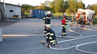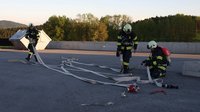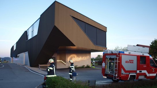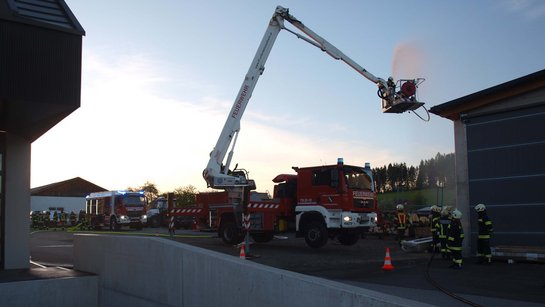 Das erst drei Jahre alte Firmengebäude diente als Übungsobjekt und bot ein realistisches Szenario für den Ernstfall. Übungsannahme war ein Brand des Materialliftes im Keller des Firmengebäudes.