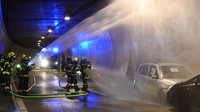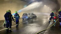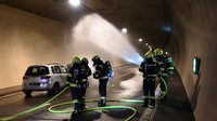 Das Highlight des Tages war ein einsatzrealistischer Löschangriff auf ein inszeniertes PKW-Brand-Szenario im Tunnel. Dabei wurde die gesamte Kette eines realen Brandereignisses durchgespielt: von der Strukturkühlung über die eigentliche Brandbekämpfung bis hin zur Wasserversorgung durch eine Zubringerleitung vom Hydranten im Tunnel.