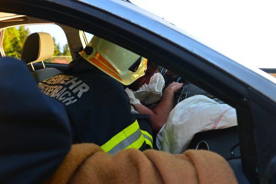 Ein von Mötlas kommender PKW krachte im Betriebsverkehr der Firma Holzbau Buchner in einen Stapler, wobei der Lenker im PKW eingeklemmt wurde und der Staplerfahrer ebenso im Führerhaus das Bewusstsein verlor, so die Übungsannahme.