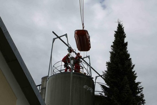 Übungsannahme war auch, dass die Teleskopmastbühne der Feuerwehr Freistadt nicht verfügbar war. So wurden über das Oö. Landes-Feuerwehrkommando die Höhenretter der Feuerwehr Schweinbach (Bezirk Urfahr Umgebung) angefordert. Diese bauten eine Seilbahn auf und retteten die Person mittels Korbschleiftrage vom Silo. 65 Einsatzkräfte standen im Übungseinsatz. Als Beobachter vor Ort waren Bürgermeister Ing. Michael Hirtl, Bezirks-Feuerwehrkommandant Franz Seitz sowie die Kommandanten Klaus Binder (FF Waldburg), Erich Lukas (FF St. Peter) und Christian Bötig (FF Schweinbach).