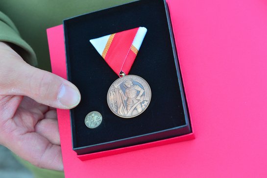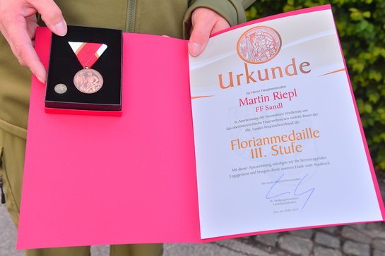 Die Florianmedaille in der III. Stufe bekam Hauptamtswalter Martin Riepl in seiner Funktion als Bewerbsleiter-Stv. für Funkleistungsabzeichen im Zuge des Bewerbes in der Landesfeuerwehrschule von Landesfeuerwehrkommandant Landesbranddirektor Dr. Wolfgang Kronsteiner für seine großartigen Leistungen überreicht.