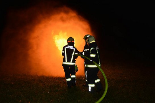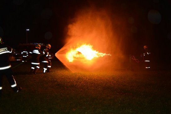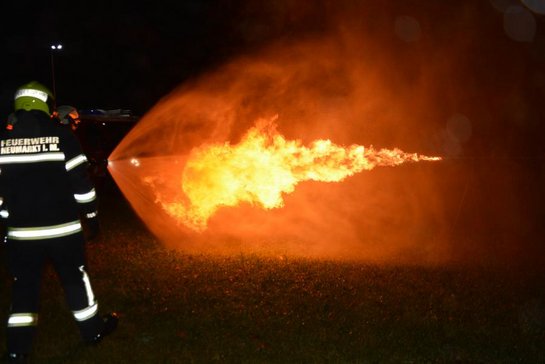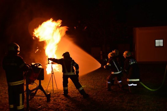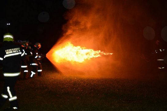 Was die Teilnehmer allerdings nicht wussten, war, dass ein sogenannter Gastrainer zum Einsatz kam. Ziel der ersten Übung war es mit dem Hohlstrahlrohr die Gasflamme "einzufangen" und unter Kontrolle zu bringen. Die nächste Aufgabe war, die Gasflamme soweit abzudrängen, dass ein Kamerad das Gasventiel schließen konnte. Nach einer theoretischen Einführung von Rainer und einer kurzen Vorführung der Oberamtswalter, konnten die Kameraden selbst die gestellten Aufgaben umsetzen. Die große Gasflamme nur wenige Zentimeter vorm Gesicht zu bändigen war eine spannende Angelegenheit für alle.