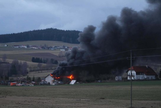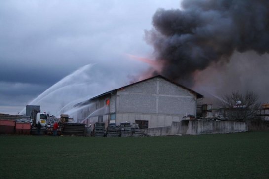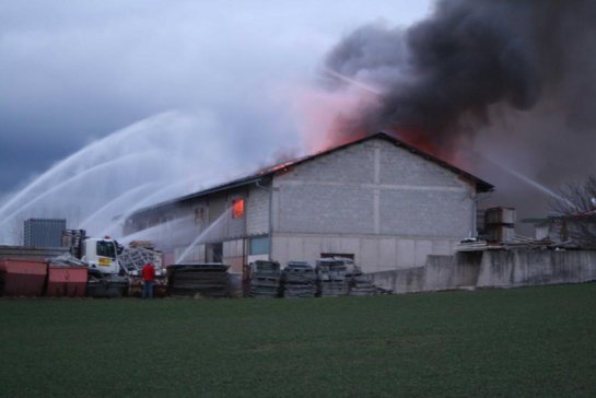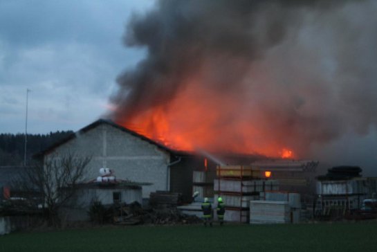 Elf Feuerwehren mit 170 Mann waren bei einem Brand in Windhaag/Fr. stundenlang im Einsatz. Bei Eintreffen der Einsatzkräfte stand die Lagerhalle einer Baufirma, in der große Mengen Dämmstoffe und Baumaterialen gelagert waren, bereits in Vollbrand.
