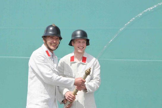Gezeigt wurden handgezogene, pferdegezogene und traktorgezogene Einsatzfahrzeuge. Und auch einen Löschangriff „anno dazumal“ mit einem pferdegezogenen Spritzenwagen, am „Steuer“ Brandrat Bruno Duschlbauer mit seinen Pferden, haben die Kameraden aus Rainbach vorgeführt. Unter den vielen großen und kleinen Zuschauern befanden sich auch Bezirks-Feuerwehrkommandant Franz Seitz und Bürgermeister Fritz Stockinger. Selbstverständlich war auch unser „Feuerwehrgeschichtsprofessor“ Konsulent Johann Sallaberger dabei und gab wertvolle Tipps zur Pflege und Erhaltung der gezeigten historischen Einsatzfahrzeuge und Gerätschaften. Für den Ehren-Oberbrandrat „Sali“ hat man sozusagen sogar ein eigenes „Dienstfahrzeug“ parat gehabt, auf dem er natürlich dann auch für ein Foto Platz genommen hat.