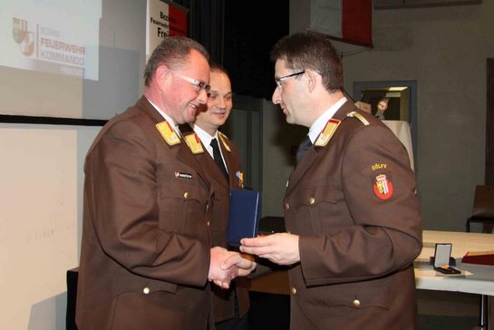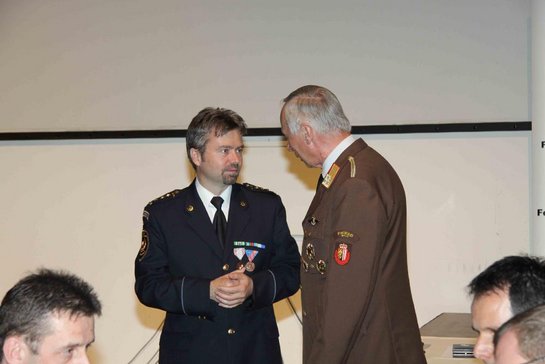 Mit dem Verdienstzeichen III. Stufe des Österreichischen Bundes-Feuerwehrverbandes ausgezeichnet wurden die Brandräte Markus Diesenreither und Thomas Wurmtödter. Landesfeuerwehrkommandant-Stellvertreter Robert Mayer überreichte die Auszeichnungen.