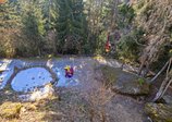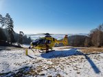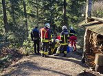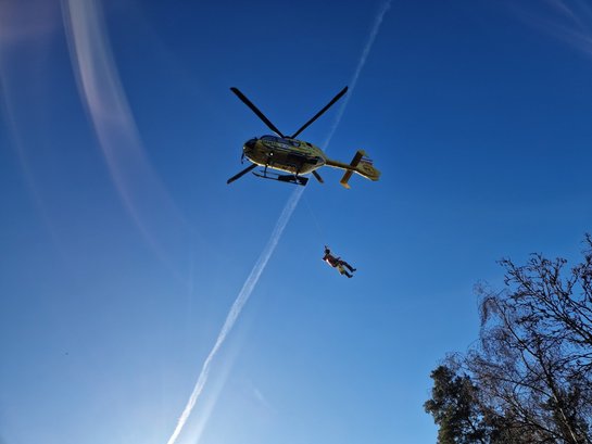 Nach der Erstversorgung durch die Einsatzkräfte vor Ort, entschied sich der Notarzt aufgrund der Geländebeschaffenheit für eine Taurettung. Der Hubschrauber positionierte sich im Schwebeflug über der Unfallstelle, während die Patientin gesichert und am Rettungstau aus dem Waldgelände geflogen wurde. Nach der erfolgreichen Zwischenlandung auf einem geeigneten Platz, wurde die Frau zur weiteren Behandlung in ein umliegendes Krankenhaus geflogen.