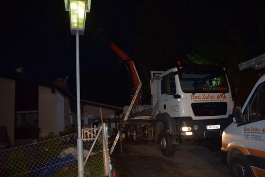 Am schwersten betroffen war jedoch ein Einfamilienhaus bei dem der Großteil des Daches durch den Sturm abgetragen wurde. Unverzüglich wurde von den alarmierten Feuerwehren Bad Zell und Erdleiten begonnen, die verbliebenen Trümmerteile zu entfernen und das Dach für eine notdürftige Eindeckung vorzubereiten. Zuvor musste jedoch noch die Stromleitung durch den Energieversorger stromlos geschalten und gesichert werden. Große Unterstützung bei dem Arbeiten erhielten die Feuerwehrkameraden von Mitarbeitern der Firma BBU, die völlig unkompliziert und unverzüglich das Material für einen notdürftigen Dachstuhl zusammenstellten und in Windeseile gemeinsam mit den eingesetzten Kameraden das zerstörte Dach provisorisch wiederherstellten.