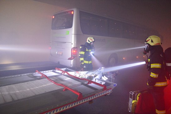 Ein Geisterfahrer verursachte einen schweren Verkehrsunfall wobei nach dem Zusammenstoß ein Brand in der Tunnelanlage ausbrach. Die Feuerwehr war in erster Etappe beschäftigt die Fahrzeuge mit den verletzten Personen aufzufinden, die Personen nach und nach aus den verunfallten PKWs zu befreien und nach draußen zu schaffen, wo diese dann anschließend dem Roten Kreuz und dem Notarzt zur weiteren Behandlung übergeben worden sind. Zur gleichen Zeit kümmerte sich ein zweiter Trupp der Feuerwehr über die Querschläge um den Brand, der nach einem Frontalzusammenstoß auch im Tunnelbereich ausbrach. Der Brand konnte rasch abgelöscht werden, wobei dadurch auch die Sicht für die Atemschutzträger sich deutlich erhöhte. Der Rettungstrupp war weiters beschäftigt einen Reisebus, der mitinvolviert war bei diesem Geschehen zu evakuieren und die Insassen zu Retten und ins Freie zu bringen wo sie Ärztlich versorg werden konnten. Einige Personen sind nach Informationen zufolge aus den Autos ausgestiegen und davongelaufen, die mussten ebenfalls aufgefunden und versorgt werden. Die verletzten Personen wurden vom Roten Kreuz in die umliegenden Krankenhäuser aufgeteilt und dorthin transportiert. Die Unverletzten wurden in die Dienststelle des Roten Kreuzes in Freistadt zu weiterer Betreuung gebracht.