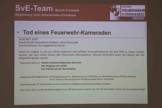 Zum Thema Sensibilisierung auf Einsätze mit Kindern, Rückmeldungen aus SVE im Bezirk von Kommandanten und Betroffenen referierte Oberamtswalter Alois Kapplmüller. Ehren-Hauptbrandinspektor Erich Feichtenschlager (FF Frauschereck) berichtete wie ein fröhliches Zeltfest durch eine Windböe zur Katastrophe und diese dann gemeinsam bestmöglich bewältigt wurde.